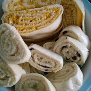 慢慢卷起来。发酵30分钟。冷水下锅蒸20分钟,闭火,闷5分钟再拿出来。