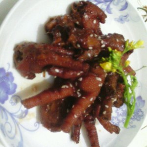 热油锅下配料爆香,再放入鸡爪翻炒,依次加入白酒、白糖、生抽老抽、腐乳,炒下。最后加水,闷几分钟,收汁出锅
