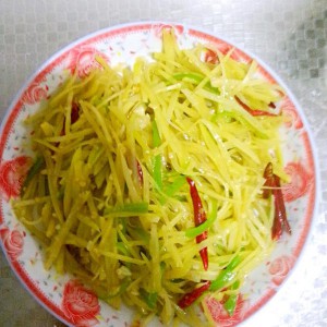 放入土豆丝跟朝天椒,因为朝天椒比较容易糊,所以不用跟葱蒜一起放。