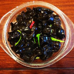 黑木耳泡软后下锅煮熟,过冰水备用,放入青椒丝、红椒丝。