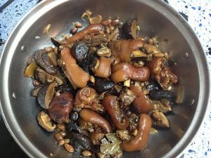 放入红皮花生、泡软的干香菇,注满开水,盖上盖焖烧(大火烧开后转小火烧)。1小时后放少许盐调味。最后猛火收汁。