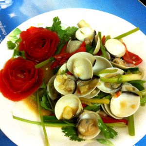 热油下锅 依次将姜、蒜、辣椒倒入翻炒后,将花蛤倒入锅中。