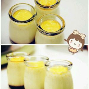焦糖的制作: 取一小锅,放入白糖80g,水80ml,用小火熬制10min左右(注意水不要加多了以便节约制糖时间),待糖汁熬出褐红色,并有焦糖香飘出时,立即停火,均匀的倒入准备好的布丁瓶子中。放入冰箱冷却