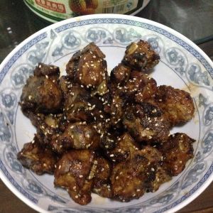 1:锅中炒菜2倍油煎排骨半熟捞出放凉。2:新油少油下锅姜片爆香捞出。3加入红糖、番茄酱熬汁。4加入排骨爆炒5放一碗料酒下去6收汁后关火加白芝麻包裹装饰。7起锅装盘