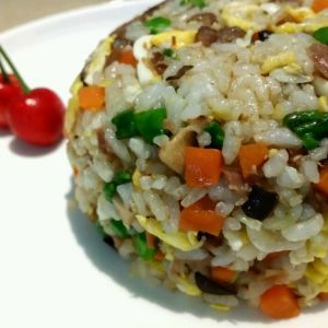 锅内放油,待鸡蛋快熟时放入米饭,将米饭炒散,放入虾皮一起炒出香味后,将之前炒好的配菜倒入,炒匀即可。