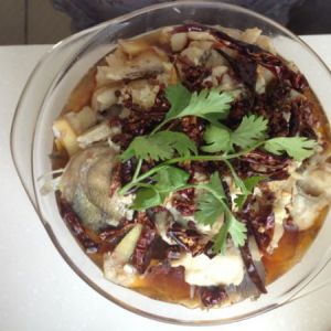 将花椒、辣椒等调料码在鱼上,锅中烧少半锅油,以能盖住容器为宜。油十分熟时泼到调料上出香味即成。