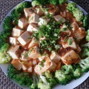 另起炒锅,放入适量油,六层热时放入胡椒、葱姜蒜,爆香后放入两大勺肉末酱(量根据个人口味),加入适量温水,煮开后,下入切好的豆腐,中火煮两分钟,加入一勺水淀粉勾芡。也可以依据个人口味再稍微加一点点盐(前面放了肉末酱已经差不多了,所以我个人没加),收汁后装在摆好的西兰花中间,撒上葱花。