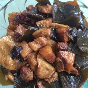加油放入肉块 花椒面翻炒 然后加糖上色 放入葱姜大料继续翻炒 之后加入海带豆皮炒匀 加汤 加盐 因为肉已经熟了 就小火炖二十分钟把汤靠干即可 开锅加味精