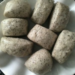 面团醒好,面板上撒些薄面粉,开始揉面团,揉好面团用刀切成大小等一的面块。