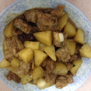 热锅放油,趁油凉放入切片的姜,蒜和八角小火炒出香味,加入排骨开大火炒到变色,再加红烧酱油炒2分钟,加入淹过排骨的水,再加生抽,鸡精,盐,胡椒粉和1粒冰糖,水开加土豆中火加盖慢炖,大概5分钟左右就可以关火装盘(放干辣椒更香,可惜老公不能吃辣)