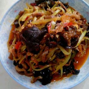 炒锅下油烧至微微冒烟,两勺郫县豆瓣下锅炒香后放入肉丝迅速翻炒1分钟后放入木耳丝及笋丝翻炒均匀后转中火(此期间迅速将白糖、食醋、蒜蓉生抽调匀)。将调好的汁淋入锅中,翻炒出香味后,出锅盛盘。