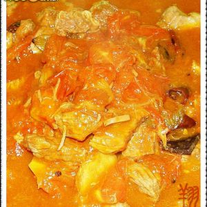 另起炒锅,入油,烧至六成热时,下葱花、干辣椒爆香,入牛腩块及番茄块翻炒,调入适量蚝油及番茄酱,翻炒均匀,将高压锅内的牛腩汤汁倒入炒锅中,大火烧滚后转小火慢炖。