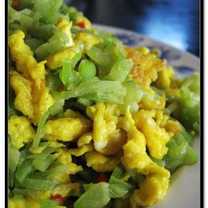 下油下蒜蓉下小辣椒,炒几下再下苦瓜。炒熟就下炒好的蛋!