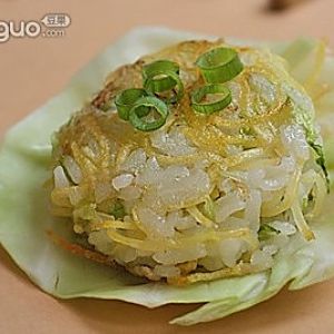 土豆、卷心菜切丝加葱花与白米饭混合在一起,加盐拌匀;