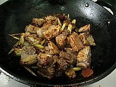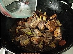 下飞过水的牛排骨煸炒,加入八角、老抽、糖和料酒炒上色;
