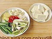 所用材料分别洗净,豆腐切大片,香茅、青蒜叶切段,泰国小鸟椒切圈,大蒜去皮,姜切片;