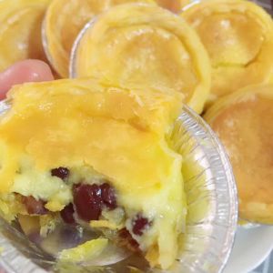 依次加入7,8分满的蛋挞液,喜欢吃蜜红豆的可以加入几粒,蔓越莓干也不错的。