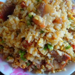 加入打散的鸡蛋液,继续翻炒。一定要快速翻炒。