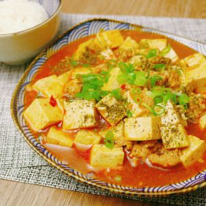 大火烧开后倒入豆腐,翻炒均润,最后大火收汁