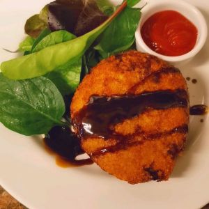 起锅烧油(需要多一些), 用筷子放入油锅如果很多小泡出现,油温适合放入可乐饼,炸至一面金黄,用铲子小心翻面。大约每面4分钟,出锅控油。salad或是莴苣丝都是很好的配菜,配上番茄酱和日式照烧酱汁,大功告成。开动
