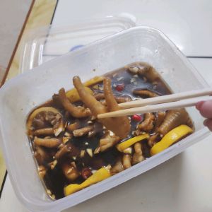 200毫升米醋和200毫升生抽加一起,加入香油,少许料酒,糖,蒜按个人口味添加。放入控干净水的鸡爪和黄瓜,加柠檬片、指天椒拌均匀,放冰箱冷藏五个小时。
