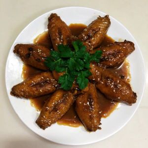 锅内放入鸡翅,加盐、料酒,生抽炒至上色。