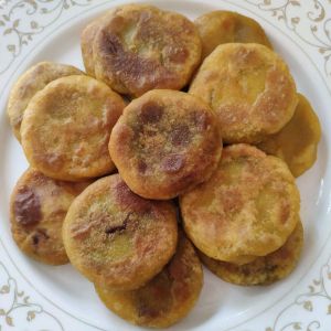 不粘平底锅放一点油,放入压偏的南瓜饼