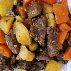 炒至冰糖融化,再加少许生抽煸炒。过一会,加土豆胡萝卜。