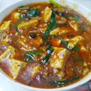 水开下入豆腐块、猪肉沫,烧至入味后分三次加入水淀粉,淋上花椒油,起锅。