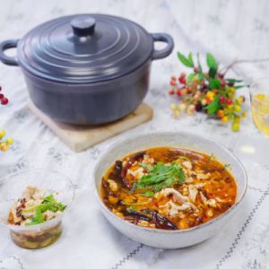 日式铸合金锅锅中倒入色拉油,放入花椒 ,姜末,干辣椒爆香