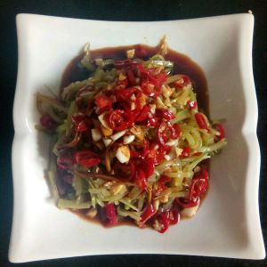装盘,一部分辣椒与莴笋丝拌匀,留少许盖在上面。放冰箱中腌2小时味道更好。