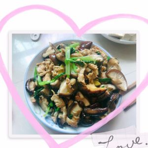 香菇翻炒后放提前炒好的肉丝,继续翻炒。