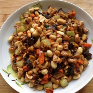 接着倒入笋丁和红萝卜'接着加入炒好的鸡肉丁。。