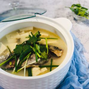 鲫鱼豆腐汤只需要简单的食材:新鲜的鲫鱼,卤水的豆腐,香葱香菜的点缀;