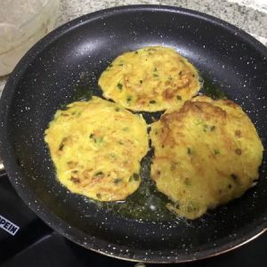 把土豆、胡萝卜、切丝加入切碎的葱、鸡蛋、胡椒粉……