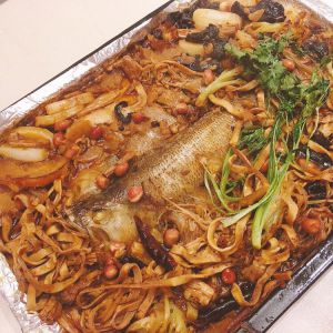 底料加配菜一并倒入鱼上,建议汤汁没过鱼身,再在烤箱里烤制15分钟,时间不要过长,蔬菜容易糊掉。
