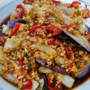 把调好的酱汁倒在茄子上面,这样就做好了。