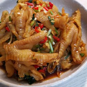 鸡爪剪掉指甲,冷水下锅,放葱,姜,大料,花椒粒。(花椒粒我忘了,后放的)