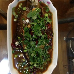 开锅,放适量油,等油热了之后,把花椒,姜先放入,香味出来后,放入红辣椒,葱,炒一炒,接着放入少许的糖,倒入酱油,不宜太少,接着放入两碗水,盖上锅盖,开锅之后把鱼放入锅中。
