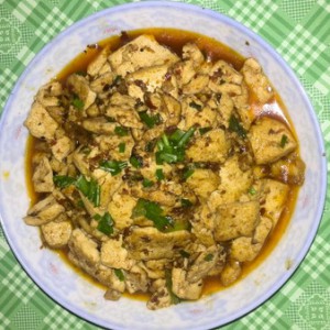 锅内余油,放入大蒜,豆瓣酱,浇入少许水,煸炒片刻。放入煎至好的豆腐块,翻炒片刻,撒入葱花,滴入芝麻香油,起锅。