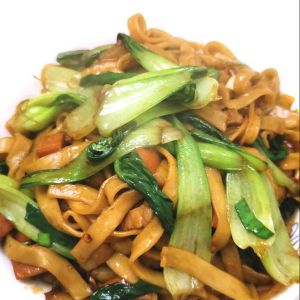 面条、上海青一并放入,大火翻炒5分钟,青蒜盐鸡精生抽老抽少许炒匀出锅!