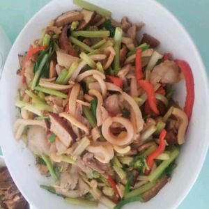 豆干出香味,肉片卷曲,下鱿鱼条翻炒到变软,放蚝油盐生抽,调好味道放50克清水闷3分钟(标准的是用泡鱿鱼的水)