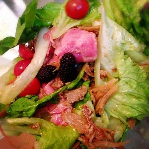 各种材料放入盆中,加色拉油,盐和奶酪搅拌。装盆,最后点缀上桑葚