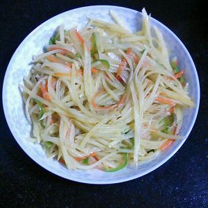 锅热入油,放入红辣椒后几秒后放入葱姜蒜爆香,放入青椒丝胡萝卜丝,翻炒两下放入土豆丝 ,翻炒