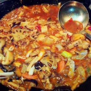 炸好的五香油留下,把调料捞出。开火葱姜蒜下锅炒香后放入郫县豆瓣,火锅底料,小火翻炒。