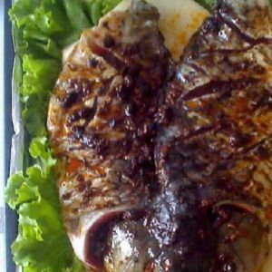 烤箱预热好后,上下火200度,将鱼放入烤20分钟。拿出在表面撒上条调料3。再放入烤箱,下火烤15分钟。即可出箱。表面可撒上香菜