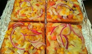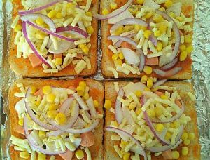 将一大勺披萨酱均匀涂抹在土司上,火腿,杏鲍菇,玉米粒,洋葱和马苏里拉芝士碎均匀的撒在土司上,最好混合撒匀…