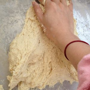 高筋面粉,奶粉,酵母,盐,糖放在案板上搅拌均匀。淡奶油,牛奶,蛋清放在碗里慢慢加入面团。把面团向前搓,然后用刮板刮回来继续搓,反复这个动作,这个时候的面团很粘手,大概搓20分钟。