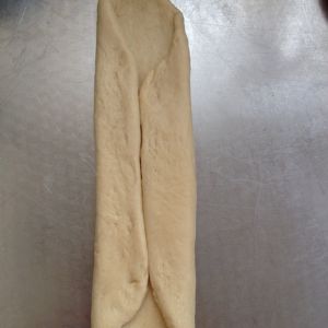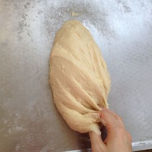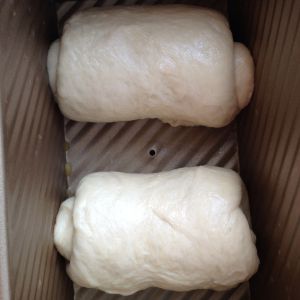 静置好的面团擀开对着再擀平,卷起来放入吐司模。