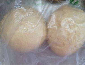面团发2-2.5倍大,排气,分成两份,搓圆放保鲜袋静置20分钟。